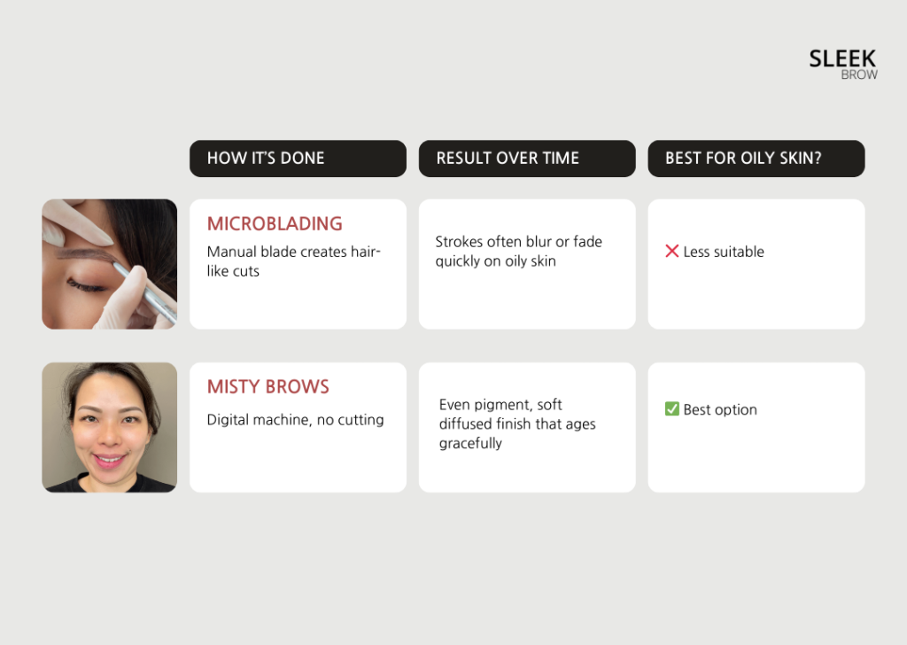 Misty brows are usually the better option. Microblading blurs faster on oily skin.