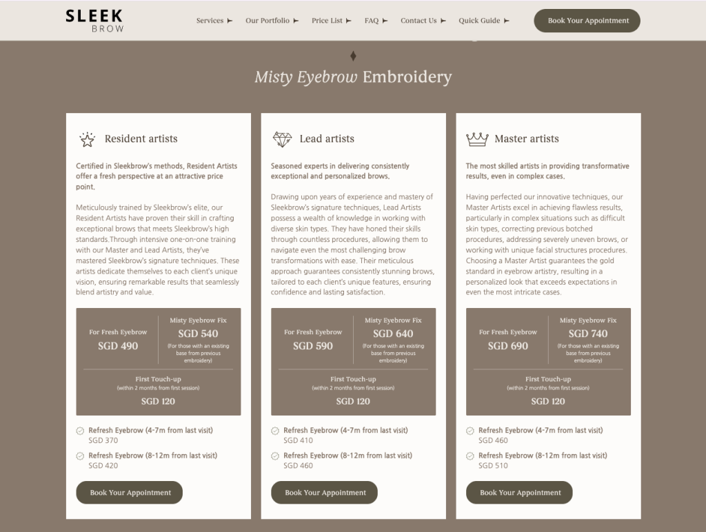 Master artists, advanced techniques, personalised brow mapping, premium pigments, ability to handle more complex brow work such as highly asymmetrical brows.